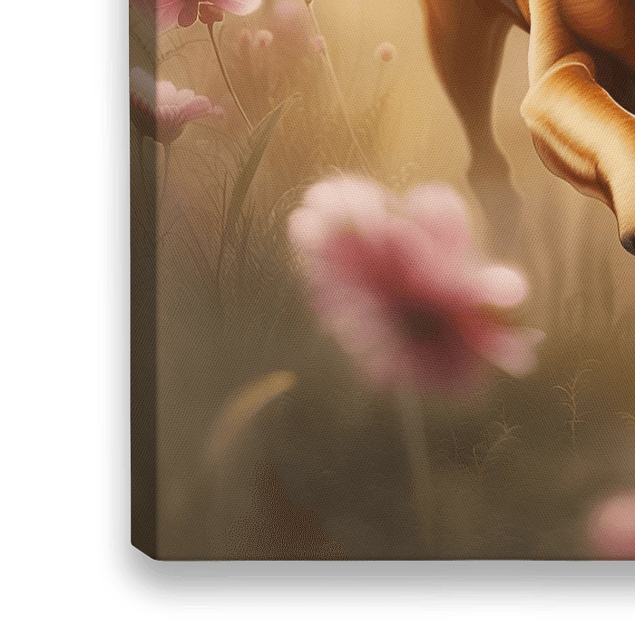 Bestelle das digitale Kunst Bild Bordeauxdogge spielt in einem Blumenfeld von Johannas Art Creations als Reproduktion auf Leinwand, Alu-Dibond, als Poster, Fototapete oder Acrylglasbild.