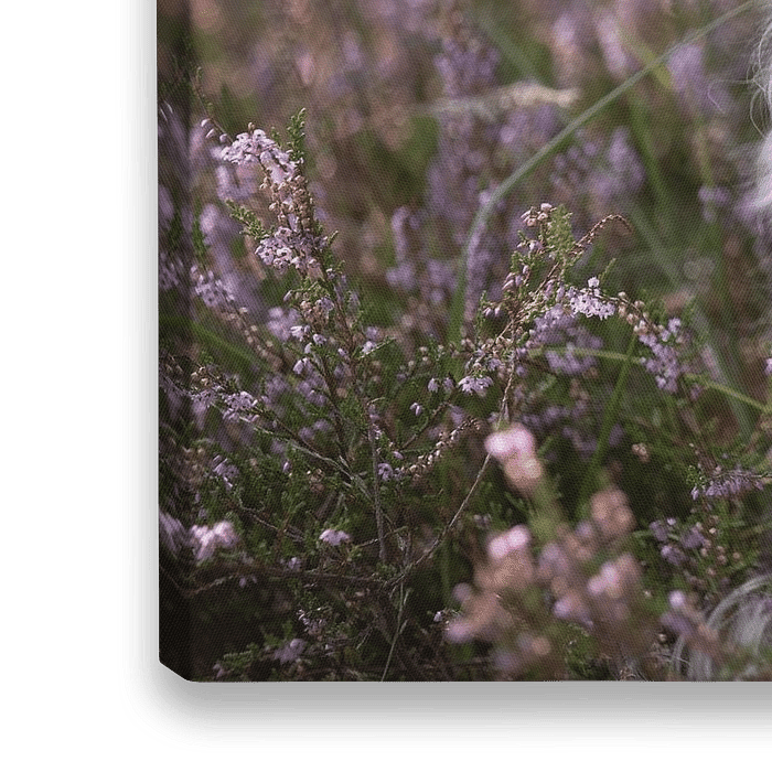 Schöner zobelfarbener Border Collie inmitten lila Heidekrautblüten. Das Heidekraut ist in der Blütezeit am schönsten.