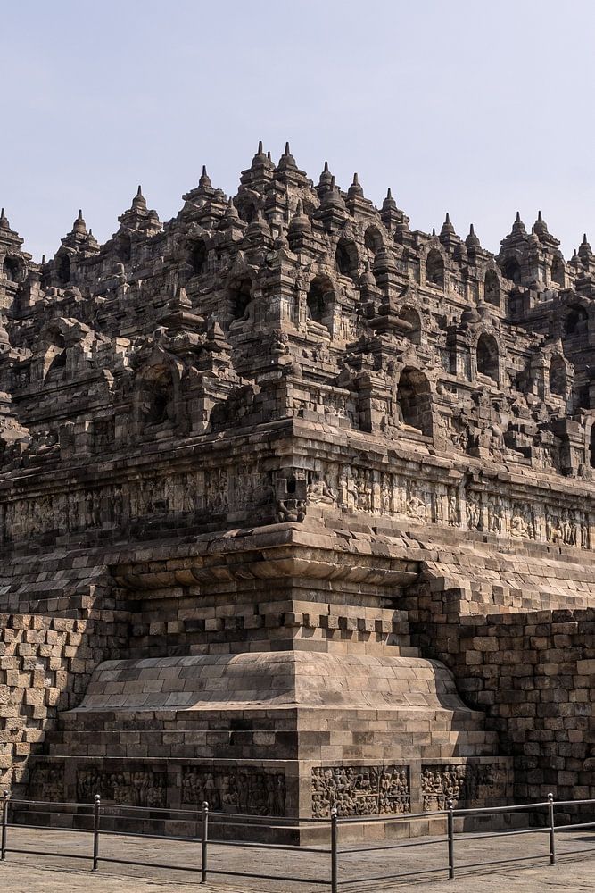 Der Borobudur-Tempel auf Java ist hier in Farbe, mit klaren Linien und einem Auge für Details festgehalten. Dieser ikonische buddhistische Tempel gehört zu den berühmtesten Wahrzeichen Indonesiens und wird in diesem Foto kraftvoll und stimmungsvoll in Szene gesetzt.
