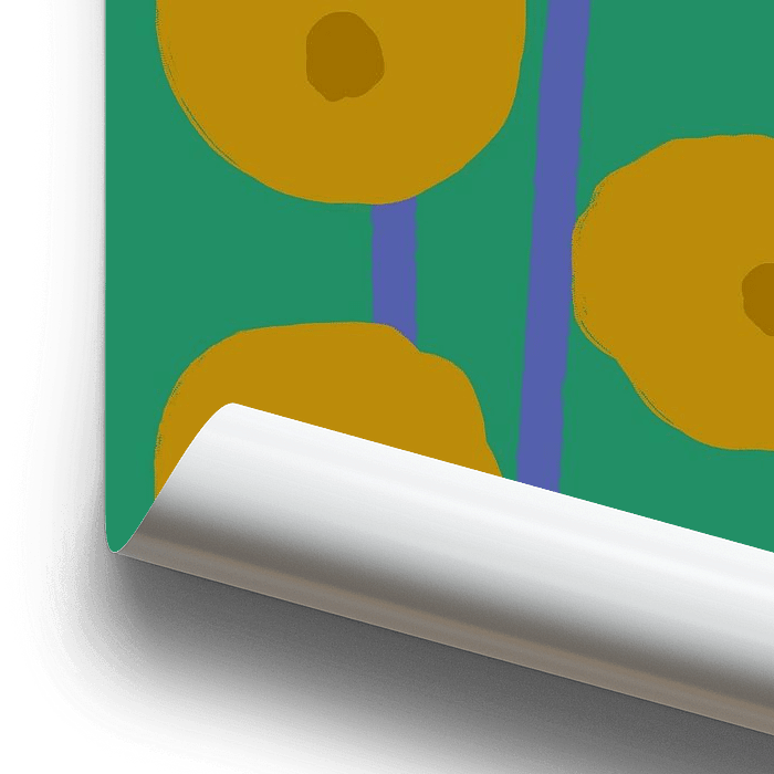 Bestelle dieses abstrakte Wandbild Botanische Skizzen. Ockerfarbene Boho-Blumen auf kobaltblau und grün. von Dina Dankers als Reproduktion auf Leinwand, Alu-Dibond, als Poster, Fototapete oder Acrylglasbild.