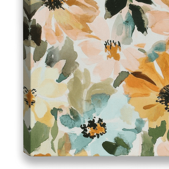 Dieses Aquarell zeigt übergroße Blumen in weichen, pastelligen Pfirsich-, Gelb- und gedämpften Teal-Tönen, die durch erdige Grün- und Brauntöne ergänzt werden. Die lockeren Pinselstriche und die transparenten Schichten verleihen dem Bild ein leichtes, luftiges Gefühl, mit subtilen Details in den Blüten und Blättern. Die…