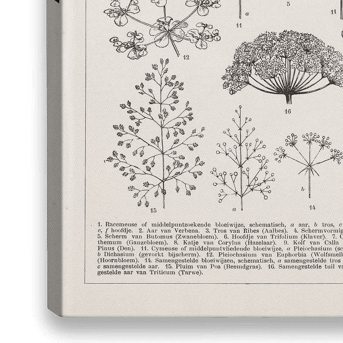 Dieser antike Druck aus der Zeit um 1900 zeigt eine Reihe von Blütenständen von Pflanzen und Bäumen.