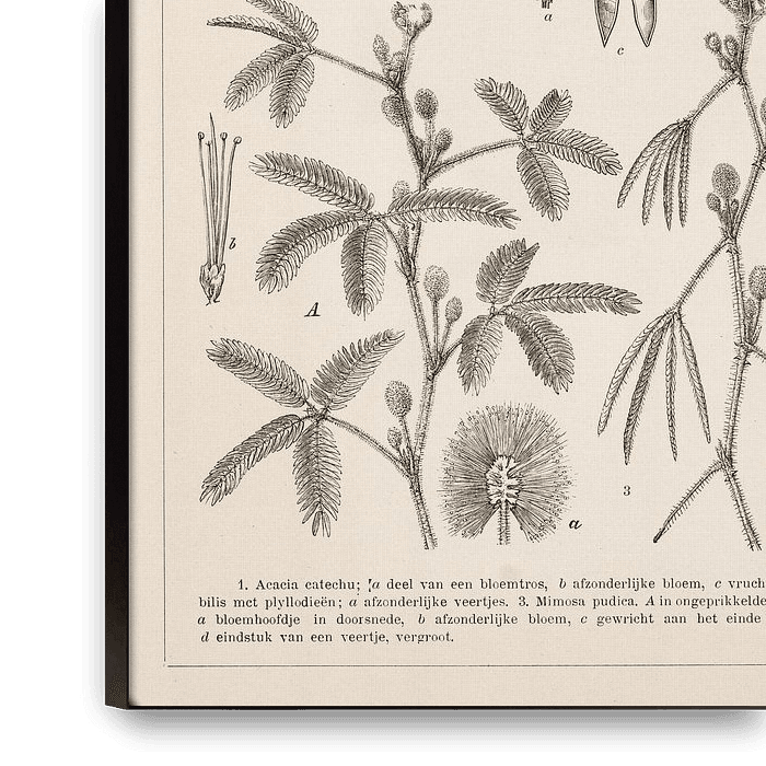 Vintage-Druck mit Pflanzen aus der Familie der Schmetterlingsblütler. Wir sehen u. a. Mimosen und Akazien.