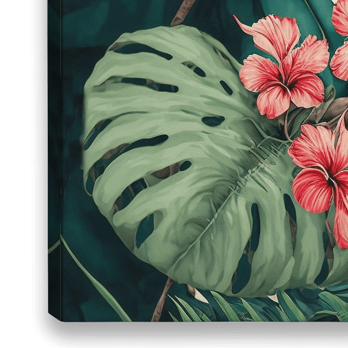 Stimmungsvolles Grün mit roten Akzenten eines Vogels und einiger Pflanzen, darunter ein Hibiskus.
