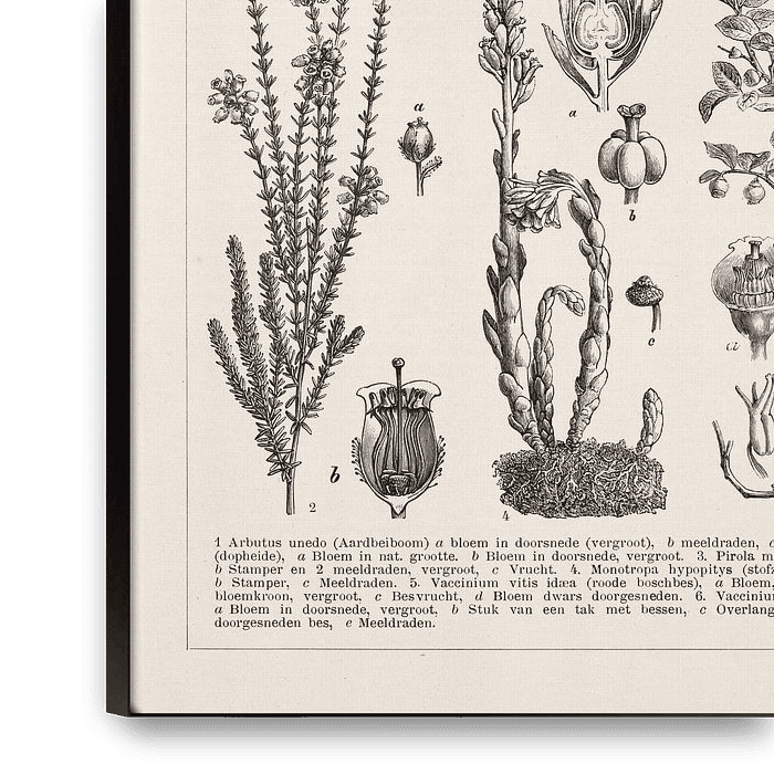 Dieser Druck aus der Zeit um 1900 zeigt eine Reihe von Pflanzen aus der Familie der Heidekrautgewächse. Dazu gehören der Erdbeerbaum, die Heide, die Rote und die Heidelbeere.