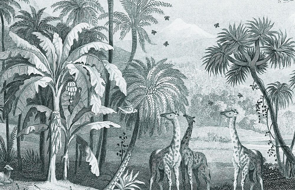 Botanischer Vintage-Dschungelteller mit Giraffen und Vögeln.
