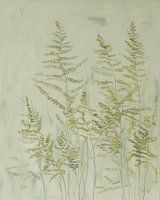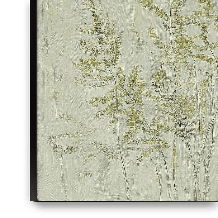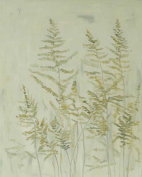 Dieses Kunstwerk zeigt eine ruhige Komposition aus Farnblättern in sanften Grün- und Beigetönen. Die feinen Linien und leichten Pinselstriche verleihen dem Gemälde eine natürliche und verträumte Ausstrahlung. Die Pflanzen scheinen fast in einem leichten Nebel zu schweben, wodurch das Werk eine ruhige und entspannte Atmosphäre…
