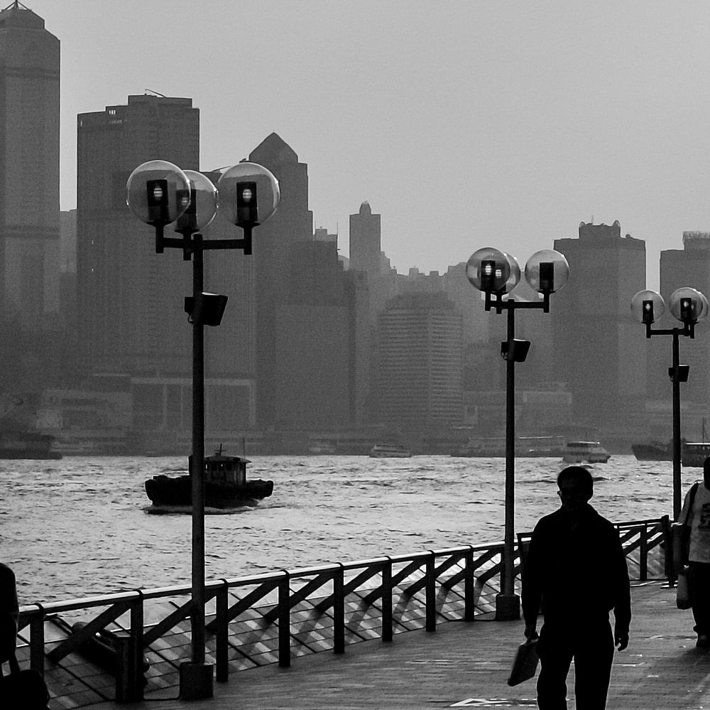 Der Boulevard auf der Kowloon-Seite von Hongkong ist ein schöner Ort zum Flanieren. Und natürlich zu fotografieren! Immer Menschen vor dem Hintergrund des Hafens von Victoria und der Wolkenkratzer auf Hongkong Island.