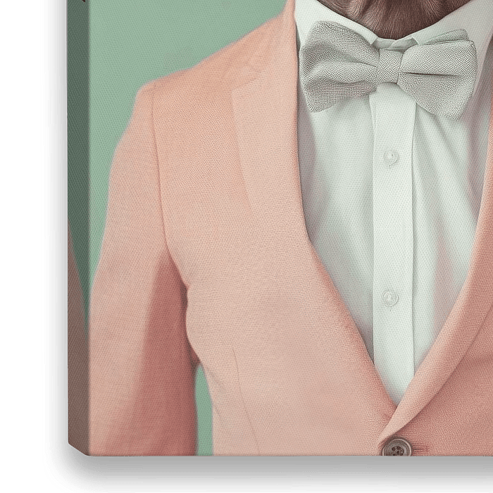 Mit einem charmanten Augenzwinkern tritt dieser stilvolle Boxer in einem eleganten Anzug auf. Sein markantes Gesicht, kombiniert mit einem jugendlichen Ausdruck und einer perfekt gebundenen Fliege, strahlt sowohl Eleganz als auch Verspieltheit aus. Inmitten des sanften Mintgrüns präsentiert er eine unerwartete Verbindung von tierischer…