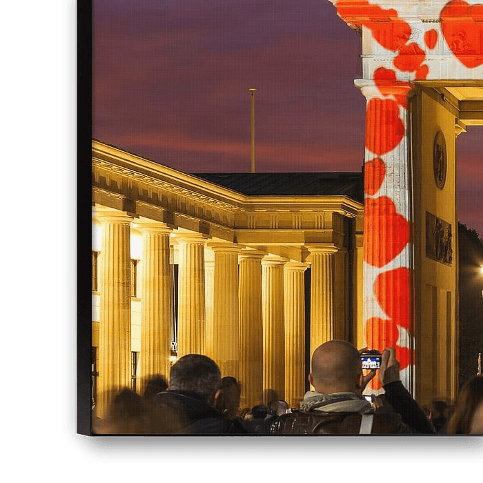 Das Brandenburger Tor in einer besonderen Beleuchtung, anlässlich eines Lichterfestes in Berlin. Hier mit Herzchen und dem Schiftzug "WE LOVE BERLIN"