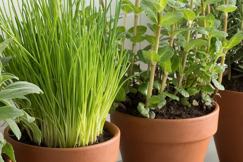 Braune Terrakotta-Töpfe mit frischen Küchenkräutern, aufgereiht mit Salbei, Minze, Rosmarin, Oregano und Schnittlauch