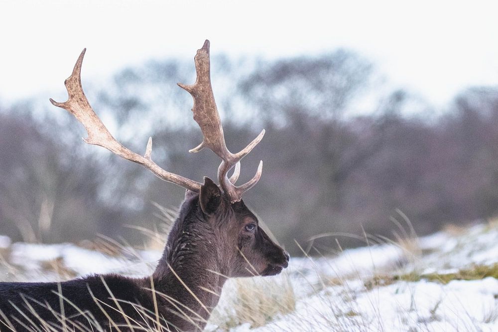 Brauner Damhirsch in den Amsterdamer Wasserversorgungsdünen. Im Schnee, Winter 2021. Schönes weißes Dünengebiet.