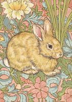 Das Werk zeigt einen hellbraunen Hasen mit dunkleren Schattierungen, der nach rechts blickt. Er sitzt auf einer gemusterten Fläche, die Vorderpfoten leicht nach vorn gesetzt, die Hinterläufe unter dem Körper. Der Hintergrund zeigt ein florales Muster mit rosa Blüten und grünen Blättern auf rötlich-rosafarbenem Grund. Die Komposition…