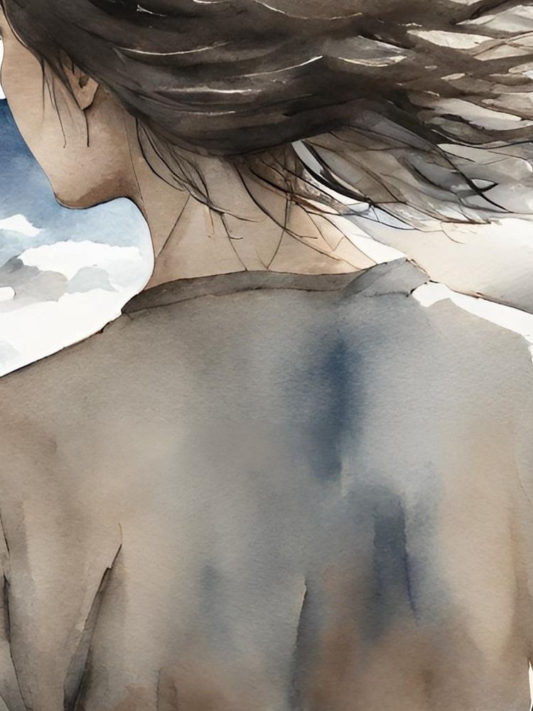 Braunhaarige Frau blickt auf das Meer, Aquarell, Wasserfarben, sanfte Töne, Haare wehen im Wind, Wellen und Meer im Hintergrund, Strandszene, Fernweh