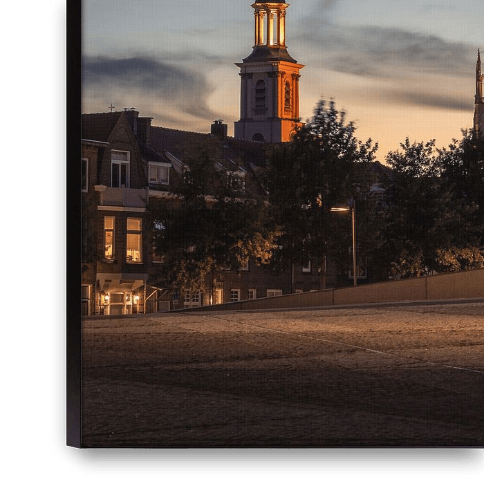 Breda Centre, Chassepromenade am Kloosterplein hinter dem Casino und Theater. Ansicht des Zentrums mit der Toren Grote Kerk Breda und der St.-Antonius-Kathedrale in der Sint Janstraat bei Sonnenuntergang und Dämmerung.