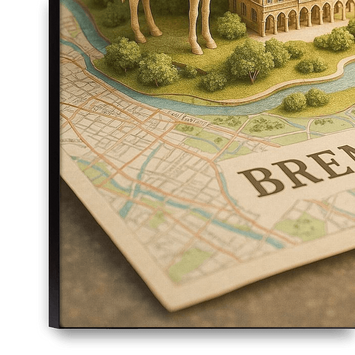 Treten Sie ein in ein Märchenbuch mit dieser charmanten Bremen 3D Diorama Karte. Dieses Kunstwerk hebt spielerisch die berühmtesten Legenden der Stadt hervor und zeigt eine riesige, skurrile Skulptur der Bremer Stadtmusikanten (den Esel, den Hund, die Katze und den Hahn), die stolz neben dem prächtigen UNESCO-Welterbe-Rathaus stehen.…