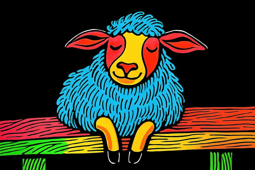 Ein Neon-Schaf mit geschlossenen Augen ruht spielerisch auf einem Balken in Regenbogenfarben, umrandet von klaren Linien vor einem tiefschwarzen Hintergrund. Das Fell ist voller Rhythmus, mit lebhaften Strichen, die Tiefe und Textur suggerieren, während das rote Gesicht und die rosa Ohren einen sanften Kontrast bilden. Dieses starke…