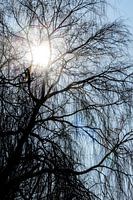 Die strahlende Wintersonne scheint durch die noch kahlen Äste einer Trauerweide. Ende Februar 2026 war es in den Niederlanden ungewöhnlich warm und sonnig, kurz nach einer kalten Winterperiode. Die Bäume sind noch kahl, die Pflanzen müssen noch sprießen und die Sonne scheint hell durch die Äste. Dieser Kontrast an der Grenze zwischen…