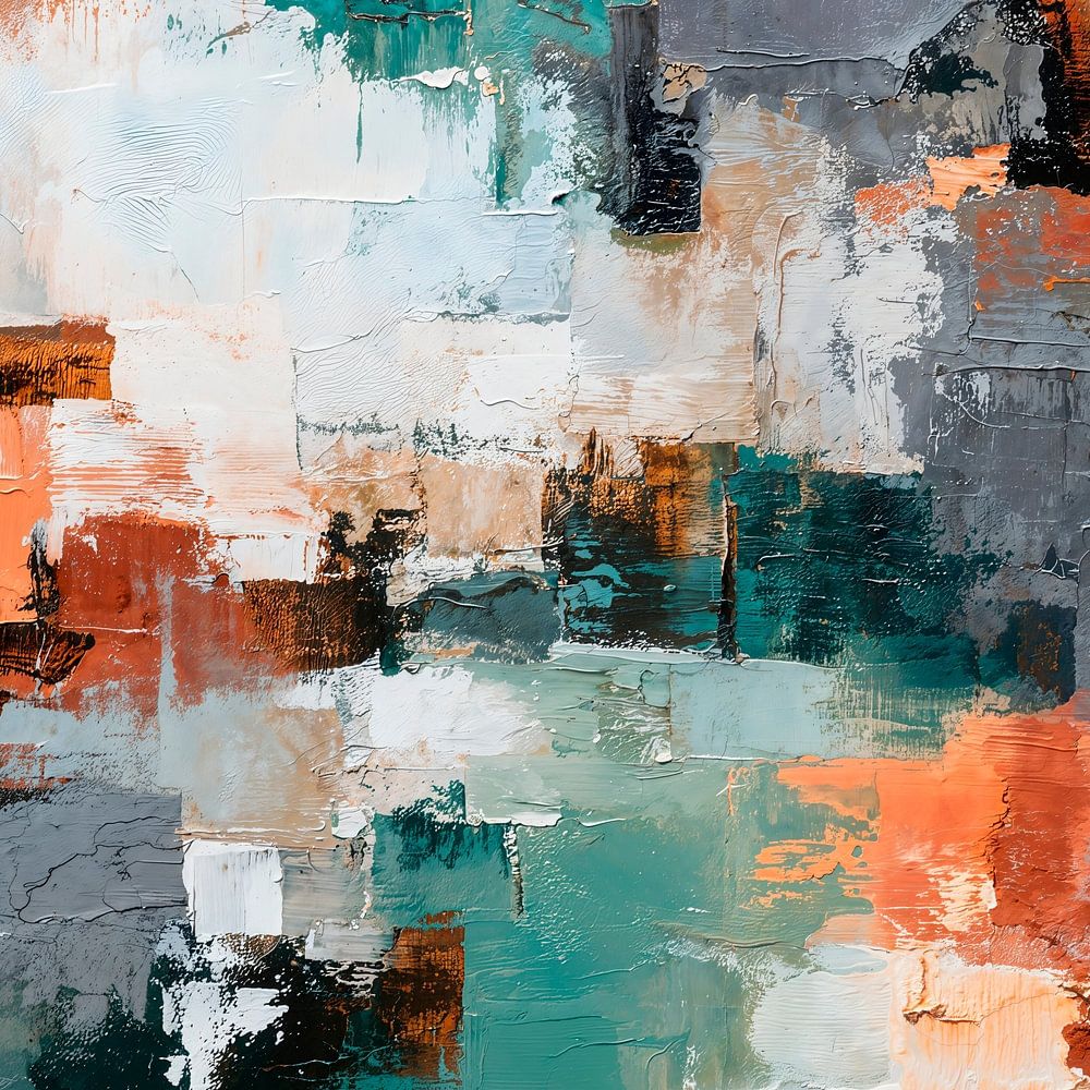 Ein abstraktes expressionistisches Gemälde mit einem dynamischen Zusammenspiel aus geometrischen Formen und kraftvollen Pinselstrichen. Die Farbpalette wird von gedämpften Tönen dominiert, die durch leuchtend weiße Flächen in einer Impasto-Maltechnik kontrastiert werden. Die Komposition ist ausgewogen und gleichzeitig energiegeladen.