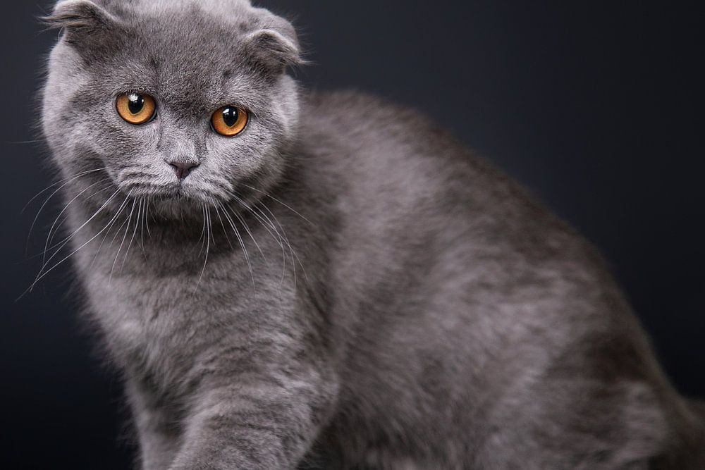 Eine britische Kurzhaarkatze (Katze) in einem kunstvollen dunklen Studioporträt mit Grautönen. Perfekt für eine schöne Wanddekoration im Haus.