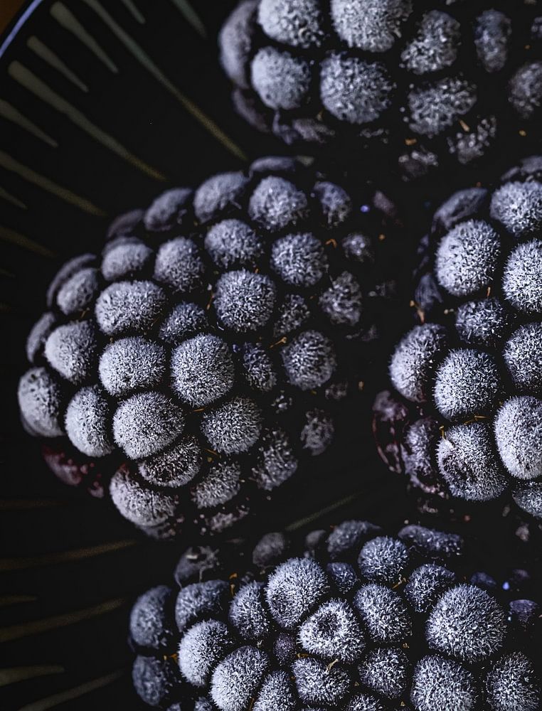 Makroaufnahme von Brombeeren, die gerade aus dem Gefrierschrank kommen. Die Eiskristalle beginnen bereits langsam zu schmelzen