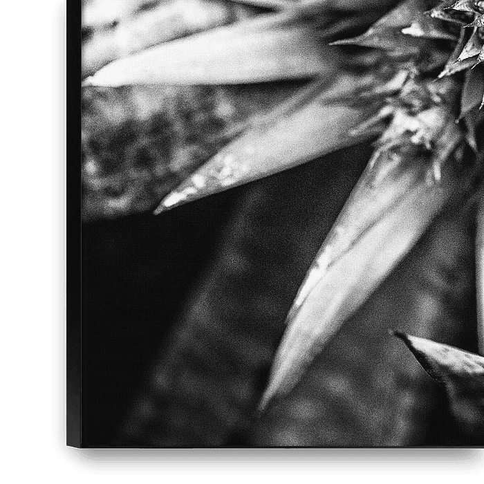 Een Bromelia, een oeroude huiskamerplant in Nederland, gefotografeerd vanuit een verrassend perspectief! Met de top vlijmscherp en een mooi bokeh erom heen. Het zwart wit maakt de opname tijdloos!