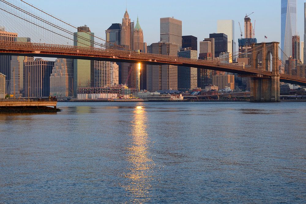 De in 1883 gebouwde Brooklyn Bridge is een hangbrug in New York over de East River. Hij verbindt Brooklyn met Lower Manhattan. De foto is genomen vanaf DUMBO, Brooklyn.