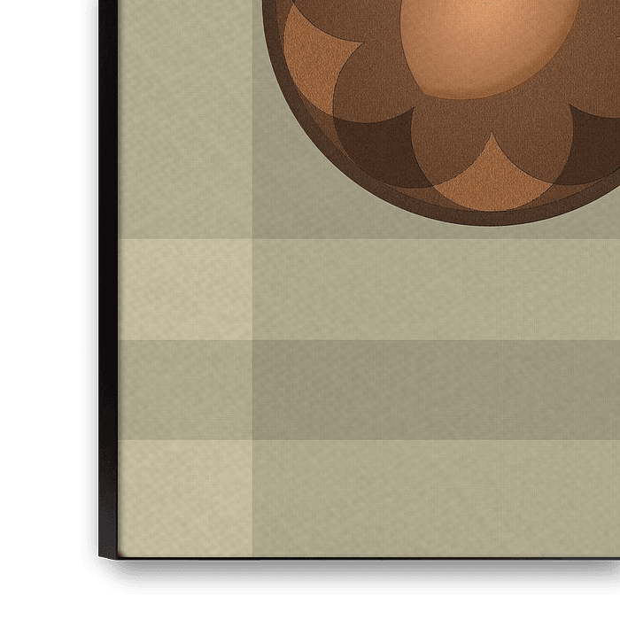 In diesem Kunstwerk gibt es ein transparentes graues quadratisches Muster, das einem Tischtuchmuster ähnelt. Darauf befindet sich ein brauner Teller mit einem schönen Muster und einem Brotlaib darauf. Die braune Farbe verleiht eine natürliche, erdige Ausstrahlung und regt den Appetit an.