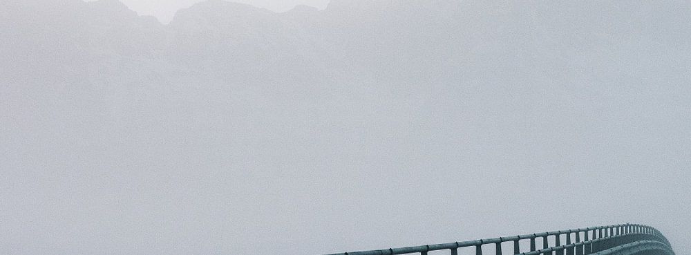 Eine Brücke im Nebel mit Bergen im Hintergrund. Henningsvær, Lofoten, Norwegen.
