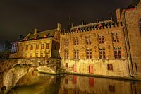 Eine sehr suggestive Szene eines Kanals in Bruges, Belgien, bis zum Nacht. Die Häuser und die Brücke im Rahmen haben wunderbare Spiegelungen im Wasser.