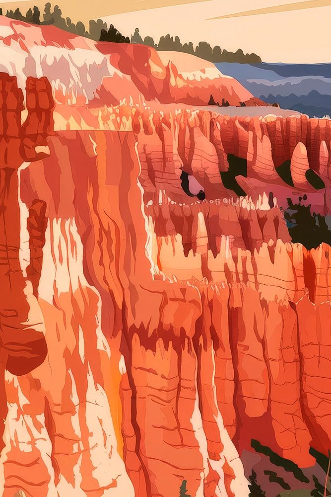 Majestätische Steinformationen in warmen Rottönen, die unter einem sanften Himmel erstrahlen, verleihen diesem Kunstwerk einen Hauch von Abenteuer und Naturverbundenheit. Die kühnen Linien und die ansprechende Farbgebung entführen in die Weiten des Bryce Canyon. Ideal für das Wohnzimmer, wo es Gespräche anregen und Fernweh wecken kann.