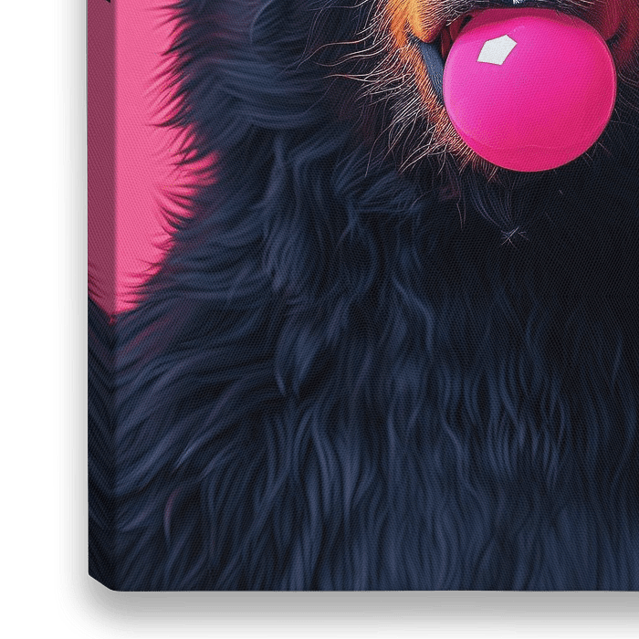 Der Bär trägt eine große, orangefarbene Sonnenbrille und hält einen leuchtend rosa Kaugummiball im Mund. Der Kontrast zwischen dem schwarzen Fell des Bären und den hellen, leuchtenden Farben der Accessoires macht das Bild…
