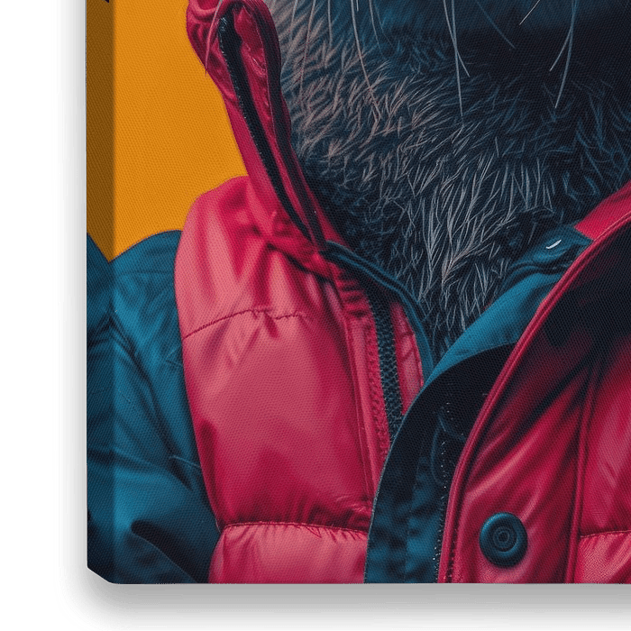 Dieses lebendige, trendige Kunstwerk präsentiert einen Otter mit unwiderstehlichem Charme, der eine leuchtend orange Brille und einen passenden Wintermantel mit rosa und blauen Akzenten trägt.