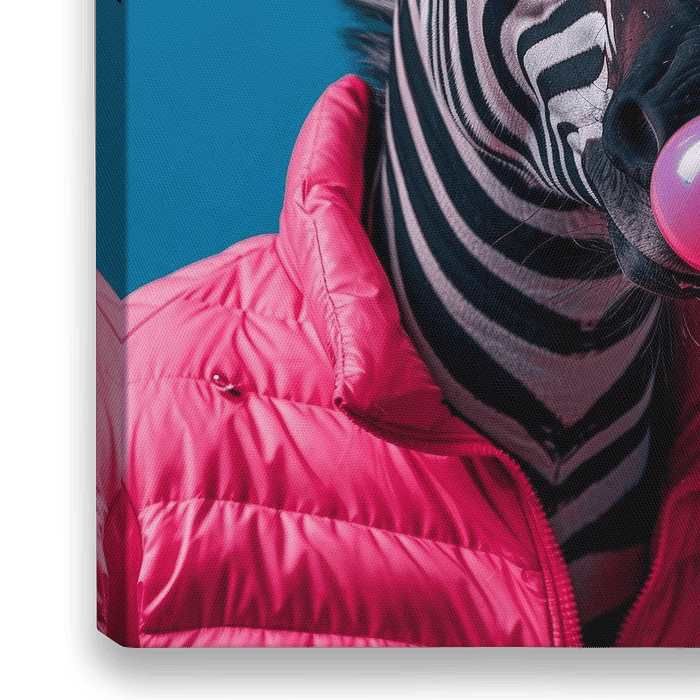 Das fröhliche Zebra steht dem Betrachter frontal gegenüber, gekleidet in einen auffälligen rosa Daunenmantel, der einen sanften Kontrast zu den grafischen schwarzen und weißen Streifen seines Fells bildet. Die leuchtend orangefarbene…