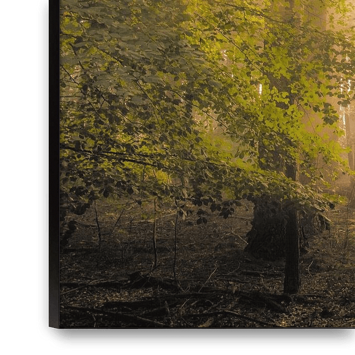Bestelle dieses Landschafts-Wandbild Buchenwaldlandschaft an einem nebligen Herbstmorgen mit Sonnenlicht durch die Baumkronen von Sjoerd van der Wal Fotografie als Reproduktion auf Leinwand, Alu-Dibond, als Poster, Fototapete oder Acrylglasbild.