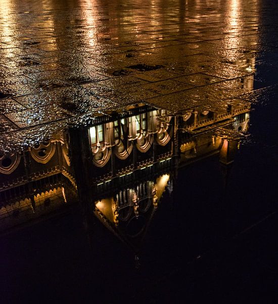 Reflexion des ungarischen Parlamentsgebäudes in einer Pfütze in der Hauptstadt Budapest nach einem heftigen Winterregen.