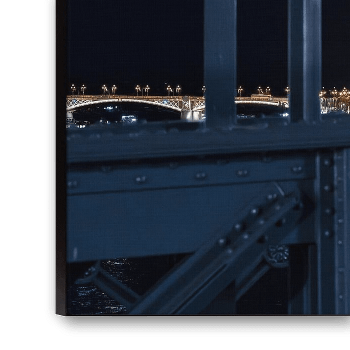 Nachtbild vom Parlament von Budapest fotografiert durch die Stahlstreben der Kettenbrücke.