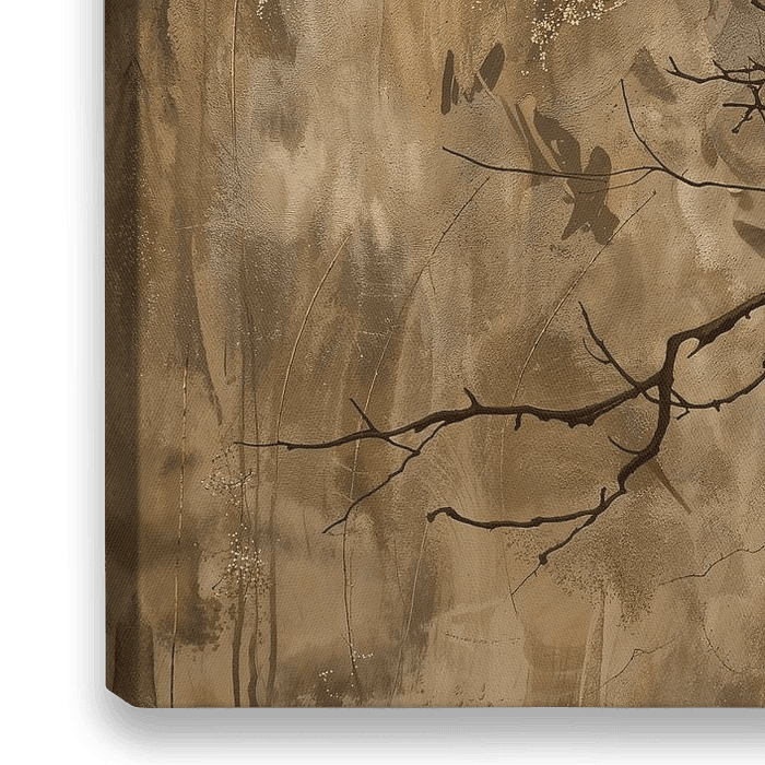 Schönes Bild eines Buddhas aus Stein auf einem goldenen und braun-beigen Hintergrund mit weißen Kirschblüten auf schwarz-braunen Zweigen. Erdige Töne wie braun, beige, gold, grau, weiß, schwarz. Zen, Gleichgewicht und spirituell. Achtsamkeit. Passend zu verschiedenen Stilen und Trends. Künstlerin: Bianca ter Riert