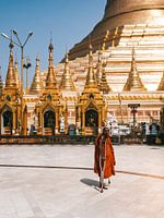 Buddhistischer Mönch mit Krücken, tagsüber in der Sonne in der goldenen Shwedagon-Pagode in Rangoon (Rangoon), Myanmar.