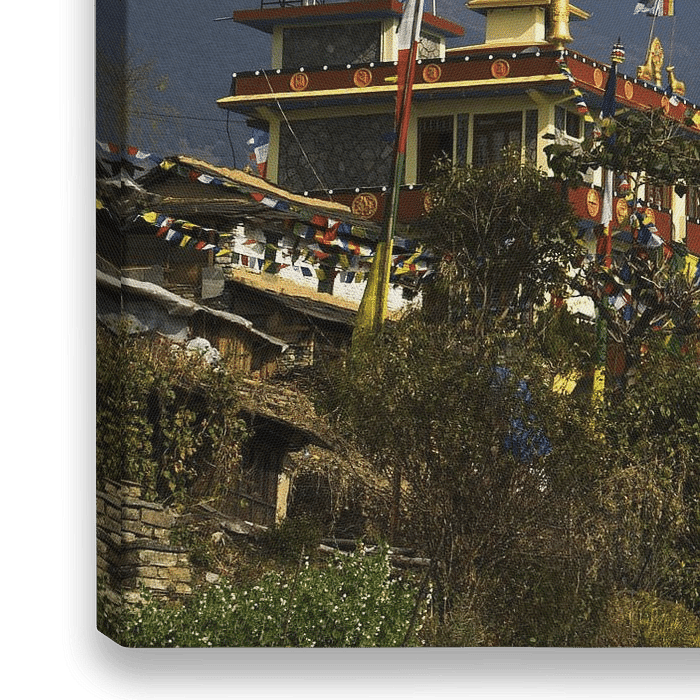 Bestelle das Foto Buddhistisches Kloster und schneebedeckte Berge von Michael Semenov als Reproduktion auf Leinwand, Alu-Dibond, als Poster, Fototapete oder Acrylglasbild.