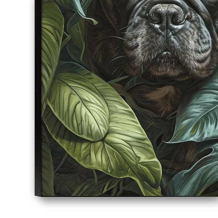 Bulldogge Realistisch - Mit viel Liebe zum Detail und einer Anspielung auf die Natur zeigt dieses Gemälde eine französische Bulldogge, die von üppigen grünen Blättern umgeben ist. Der hyperrealistische Stil erweckt Textur und Tiefe zum Leben, wobei die funkelnden Augen und der aufrichtige Ausdruck der Bulldogge sofortige Zuneigung vermitteln.