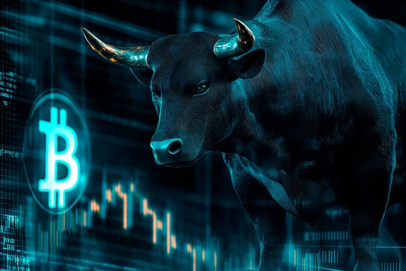 Bestelle das Foto Bullenmarkt mit Bitcoin-Logo von Poster Art Shop als Reproduktion auf Leinwand, Alu-Dibond, als Poster, Fototapete oder Acrylglasbild.