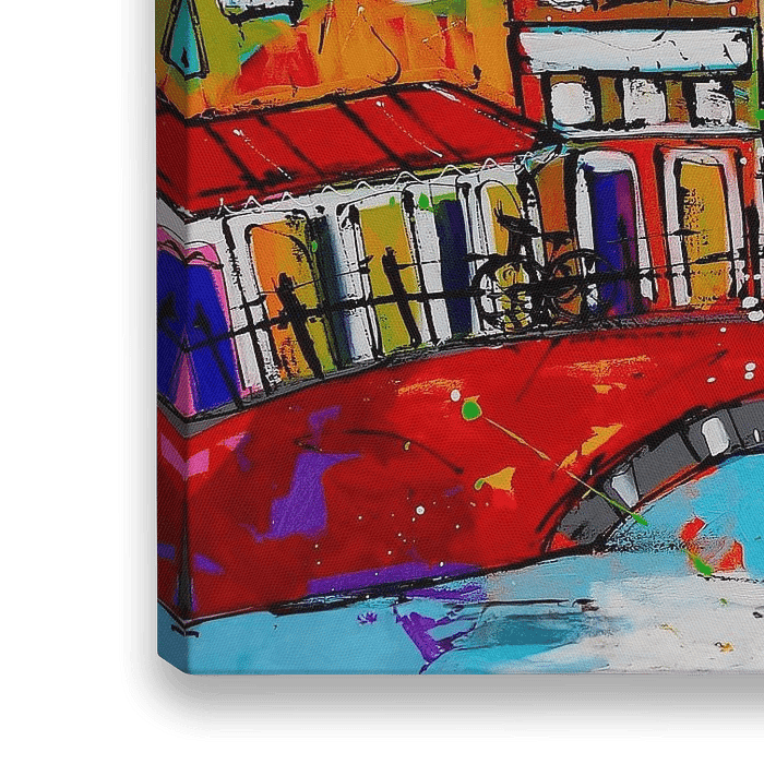 Bestelle diese Malerei Bunte Amsterdamer Grachten | Blau von Vrolijk Schilderij als Reproduktion auf Leinwand, Alu-Dibond, als Poster, Fototapete oder Acrylglasbild.