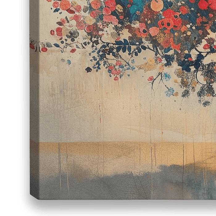 Farbenfrohes Baumgemälde | Ewiger Frühlingszauber - Dieses farbenfrohe Baumgemälde fängt eine wunderschöne Darstellung eines robusten, majestätischen Baumes ein, dessen Äste mit einer Explosion von Blumen und Früchten übersät sind. Der Baum steht im Mittelpunkt des Gemäldes. Sein dicker, gewundener Stamm ist in tiefen Blau- und…