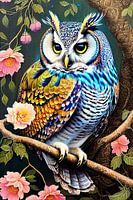 Bestelle dieses Blumen-Wandbild Bunte Blumeneule auf Ast von Maud De Vries als Reproduktion auf Leinwand, Alu-Dibond, als Poster, Fototapete oder Acrylglasbild.