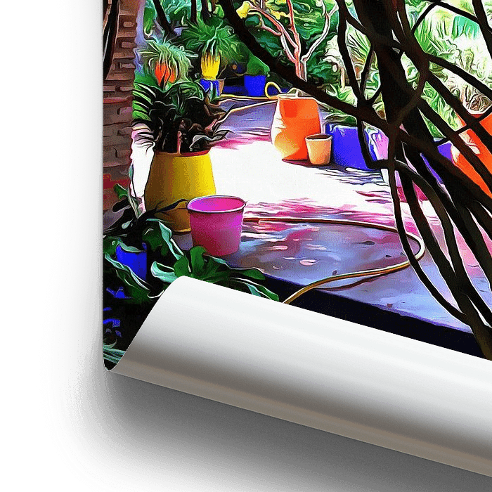 Dies ist eines meiner persönlichen Lieblingsbilder, das ich aus Fotos erstellt habe, die ich im Jardin Majorelle in Marrech, Marokko, aufgenommen habe. Wir stehen im Schatten unter einem überdachten Steg mit gemauerten Säulen und Kletterpflanzen, die die Struktur überwuchern, und blicken durch die Zweige der Kletterpflanzen auf eine sonnige Szene dahinter. Dort stehen eine Nase und ein rosafarbener Eimer, mit dem die farbenfrohen, mit tropischen Pflanzen bepflanzten Töpfe bewässert wurden, die wir sehen. Die Töpfe sind in leuchtenden Farben gehalten, gelb, orange und blau, und alle brennen in der heißen afrikanischen Sonne. Ein wunderbarer Anblick, der Licht und Schatten kontrastiert.