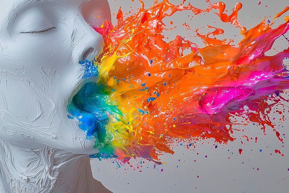 Dieses Kunstwerk stellt eine Skulptur dar, die eine Explosion bunter Farbe aus ihrem Mund zu spucken scheint. Der Kontrast zwischen dem reinen Weiß der Figur und den leuchtenden Farben symbolisiert den Ausdruck von Emotionen, Kreativität oder inneren Kämpfen, die sich Bahn brechen.
