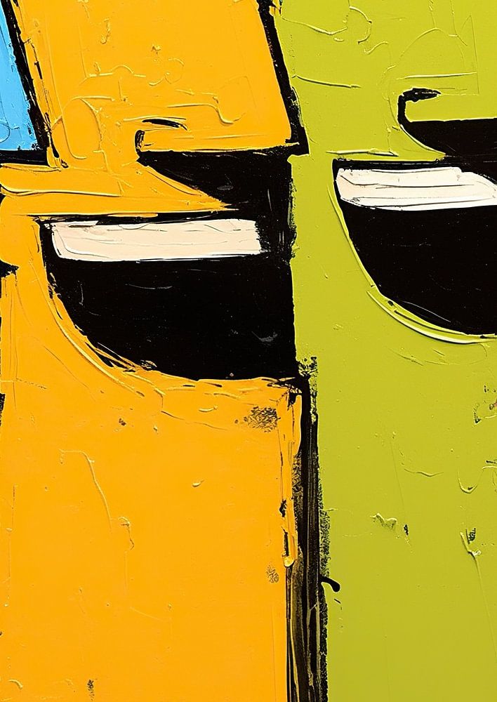 Colourful Figures - Dieses abstrakte Gemälde zeigt vier farbenfrohe menschliche Figuren in auffälligen Farben wie Blau, Gelb, Grün und Rosa, mit einfachen Gesichtern, die fröhlich lächeln und einen verspielten Blick haben.