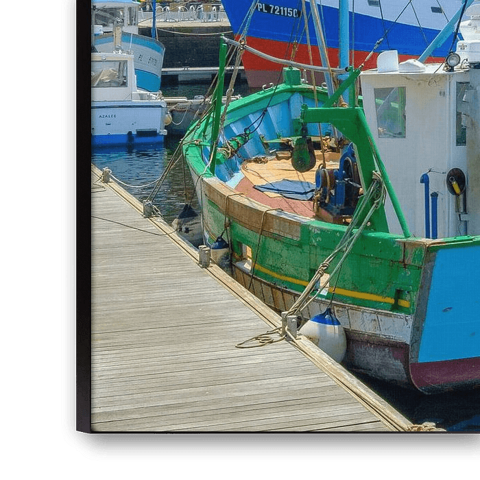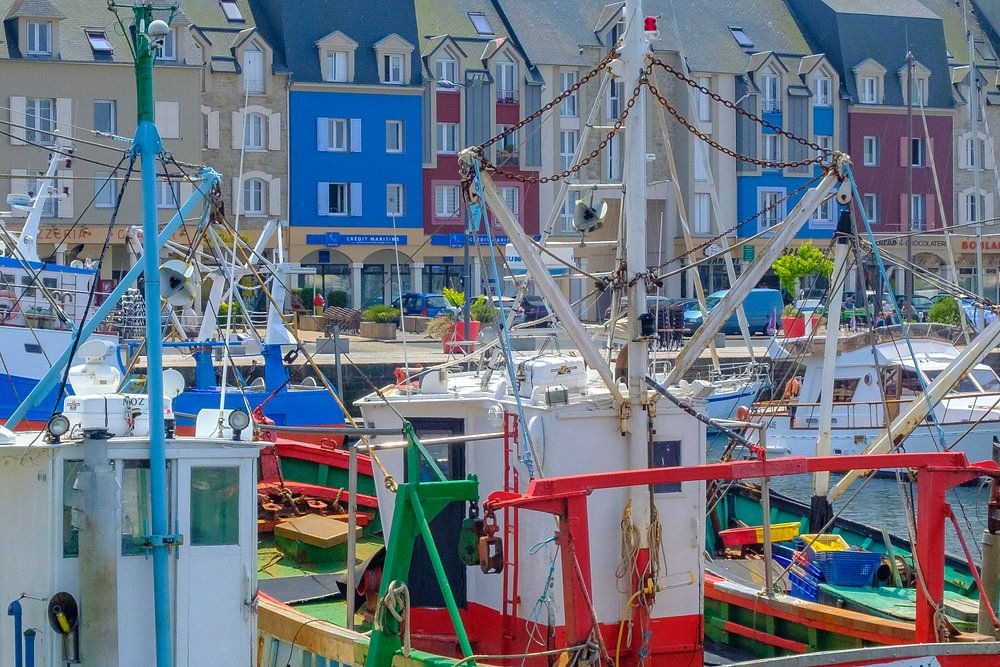 Bunte Fischerboote im Hafen von Paimpol in der Bretagne, Frankreich, im Sommer mit farbigen Gebäuden im Hafen im Hintergrund.