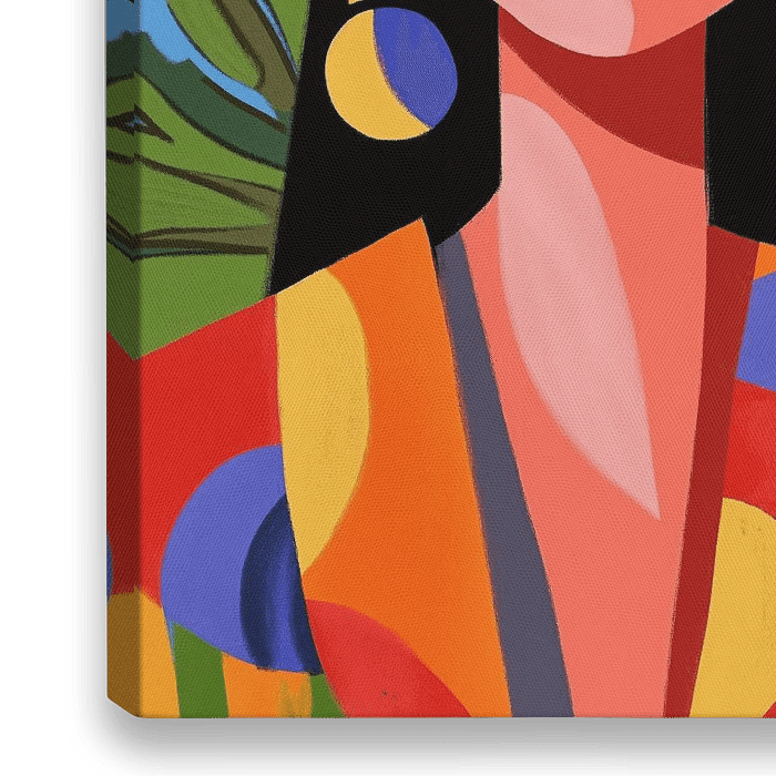 Dieses Kunstwerk ist eine ausdrucksstarke, abstrakte Darstellung des Gesichts einer Frau in einem modernen, farbenfrohen und geometrischen Stil. Die intensiven Farben und kräftigen Linien spiegeln ein Gefühl von Kraft, Geheimnis und Schönheit wider. Das Werk erinnert an eine zeitgenössische Interpretation einer tropischen oder…